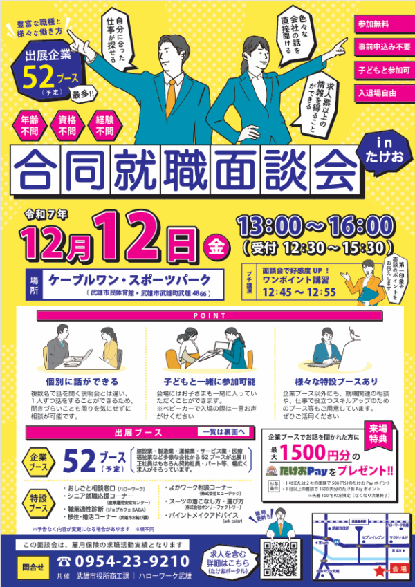 INFORMATION お知らせ 12/12(金)武雄市合同就職面談会のお知らせ 2025-12-05 12月12日(金)にケーブルワン・スポーツパークにて開催されます合同就職面談会に出展いたしますご興味ありましたらぜひお越しくださいお待ちしております! お知らせ一覧